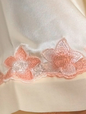 The delicate floral lace motif is colour coordinated with finest silk crepe satin and georgette in the vibrant summer colour of peach amber and the calm neutral colour of camomile. The design is exquisite, elegant, crisp, summery and feminine; The long negligee is trimmed with matching colour floral lace and ties in front with a simple belt.